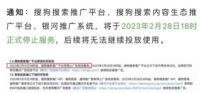 2023年2月15日18时起,搜狗搜索推广 平台将停止广告投放服务。2023年2月28日18时起,搜狗搜索推广 平台正式下线不再支持访问。